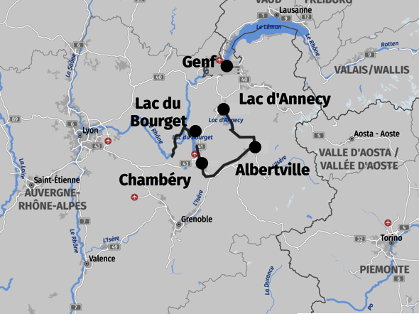 Hinweis: Die Etappen sind mit ca. 65 km kalkuliert, können je nach Tempo und Besichtigungszeiten aber verkürzt werden. Die Strecke verläuft meist flach auf asphaltierten Radwegen oder ehemaligen Bahntrassen entlang von Flüssen, Kanälen und Seen, mit wenigen Abschnitten auf stärker befahrenen Straßen. Das Profil ist überwiegend flach, jedoch gibt es auch steilere Passagen, besonders rund um den Lac d’Annecy. Der Schiffstransport auf dem Lac du Bourget (für Personen und Räder) ist außerhalb der Sommermonate nur auf Anfrage verfügbar. Ansonsten ist die Überfahrt evtl. auch ohne Räder möglich oder der Bus fährt bis zur Abtei Hautecombe.